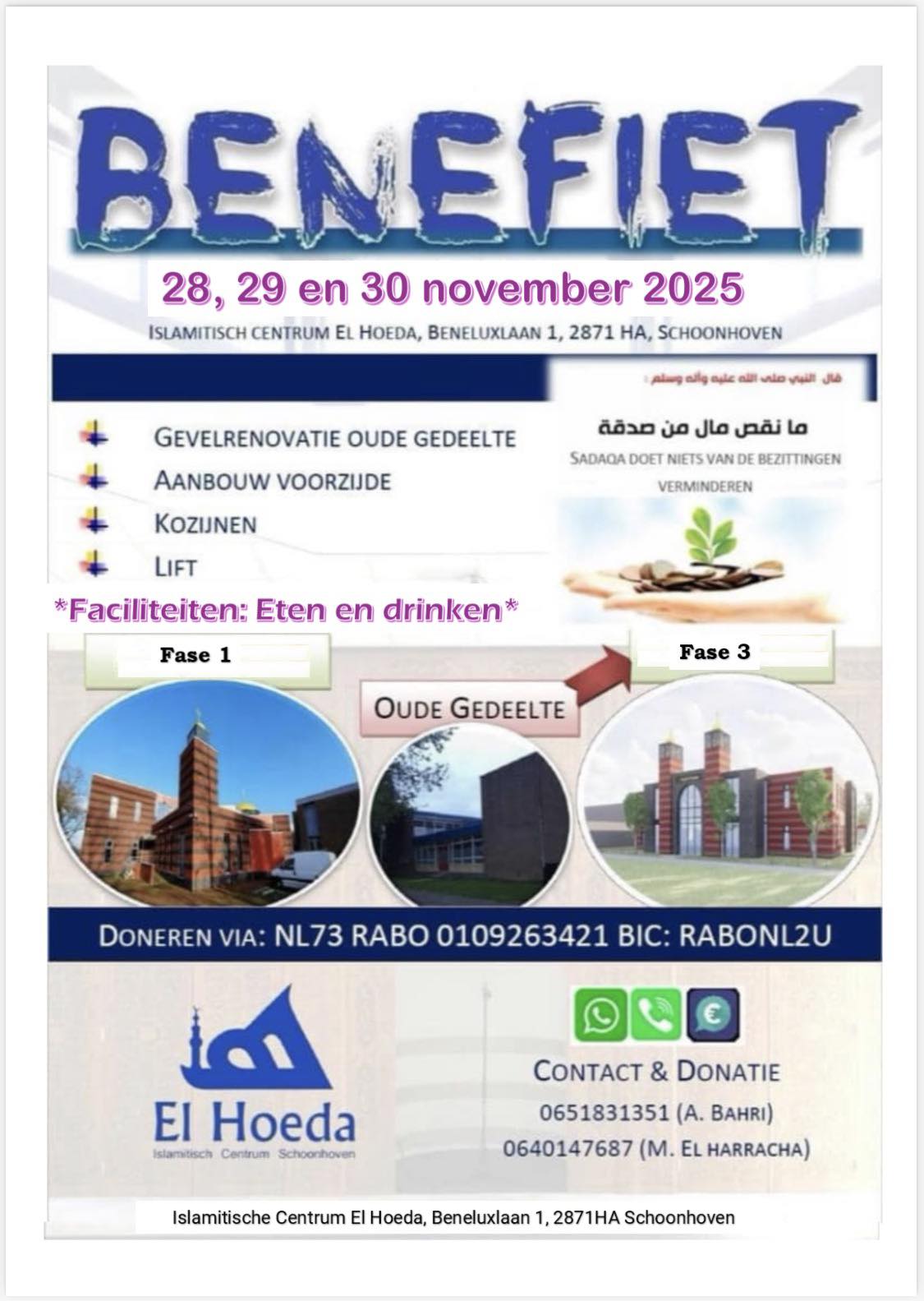 Op 29, 30 november en 1 december 2024 organiseert moskee El Hoeda een benefiet. Fase 2 is bedoeld voor de renovatie van het oude gevelgedeelte van het gebouw. Met de renovatie is het de bedoeling om ook een kleine uitbouw te realiseren voor een praktischer gebruik van het gebouw. De moskee zetten we neer voor ons zelf maar zeker ook voor degenen na ons (onze kinderen). Een plek die ons helpt in het vasthouden aan onze Islamitische identiteit. Daarom oeten we vrijgevig zijn. De realisatie is een beloning op zich maar de beloning is Insha’Allah nog groter in het hiernamaals. Doe mee, geef uit voor het huis van Allah (سبحانه وتعالى ), deel het bericht met vrienden, familie en spoor elkaar aan om vrijgevig te zijn. Moge Allah (سبحانه وتعالى ) jullie rijkelijk belonen.